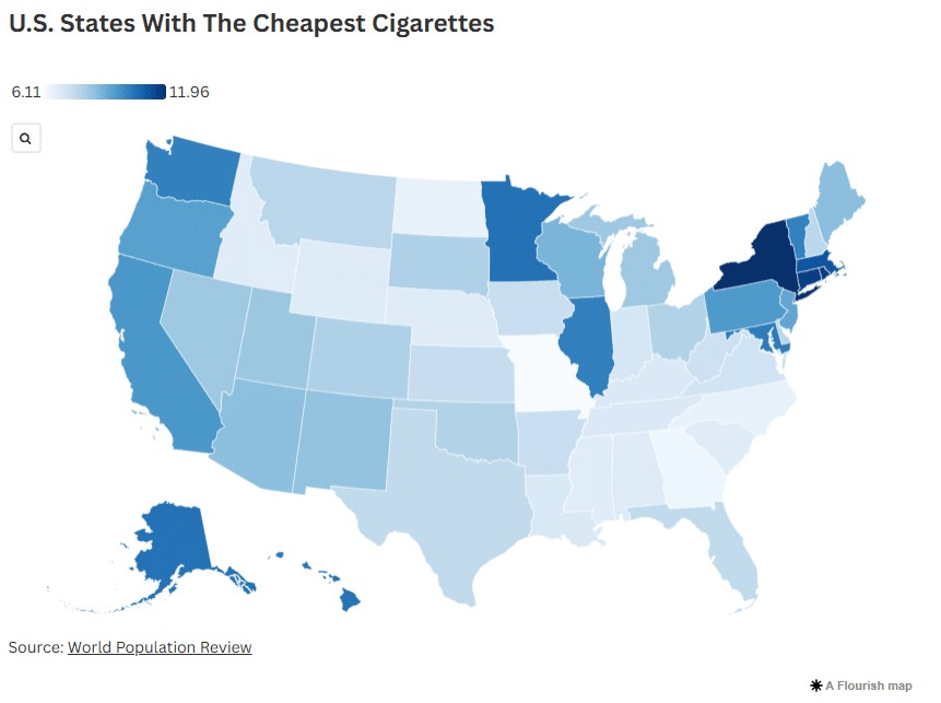 Cigarette prices in America vary from $6.11 to $11.50 per pack, the international publication Newsweek created a map of how these prices vary across states. In states where cigarettes are less expensive, smoking rates tend to be higher.